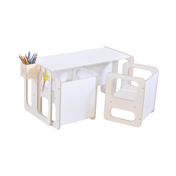 A Montessori asztal és szék szett hosszútávon kihasználható, hiszen megfordítható, így követi a gyermek növekedését. Számos lehetőséget rejt magában, használható asztalként, padként, székként, könyvespolcként, játéktárólóként, éjjeliszekrényként, de a legjobb, ha hagyjuk a gyermek fantáziáját kibontakozni és rábízzuk e remek bútor sokrétű felhasználását.